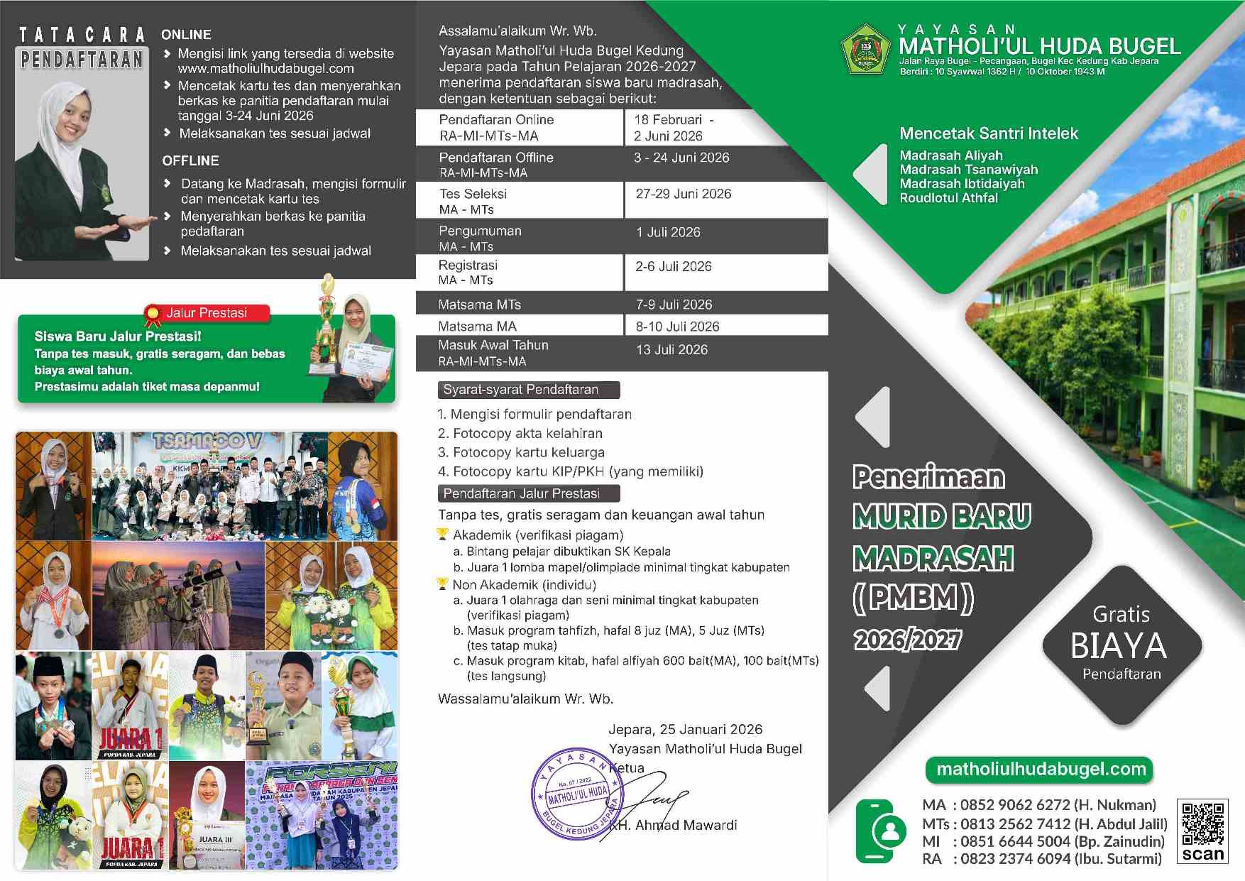 Memuat link informasi, tanggal penting, syarat pendaftaran, serta pendaftaran jalur prestasi. Calon peserta dapat mengakses detail persyaratan dan prosedur melalui tautan yang tersedia untuk memastikan kelengkapan dokumen sebelum mendaftar