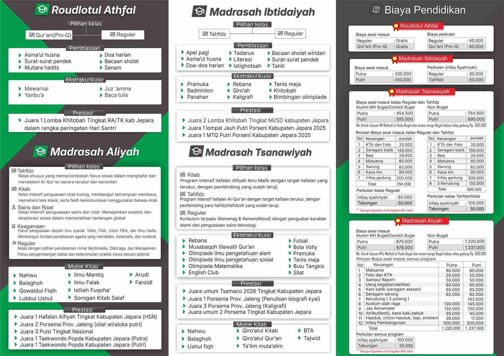 Informasi tentang MA, MTs, MI, dan RA, mencakup prestasi, program unggulan, serta berbagai ekstrakurikuler. Pengguna dapat mengetahui keunggulan masing-masing jenjang pendidikan dan kegiatan yang mendukung pengembangan akademik serta non-akademik siswa